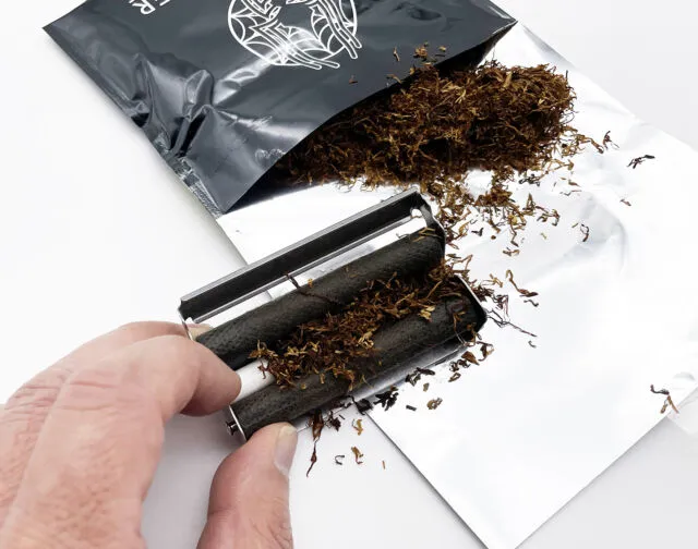 ブラックスパイダーブランドの他の銘柄同様、焦げ茶色の葉と黄色い葉が混じり合うように入り組んでおり、その刻みは細かいです。おそらくバージニア葉、オリエント葉のようにも見えますが、ミドル程度の硬さで、巻きやすそうな印象を受けました。
